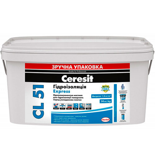 Гідроізоляційна однокомпонентна мастика для гідроізоляції поверхонь усередині приміщень, що експлуатуються у вологому середовищі (крім басейнів). Мастика Ceresit CL 51 призначена для гідроізоляції стін та підлог у приміщеннях, що експлуатуються у вологому середовищі (ванні кімнати, душові, санвузли та ін. приміщення цивільного та промислового призначення), перед облицюванням плиткою. Може використовуватися як гідроізоляційний шар у підлогах з підігрівом. Ефективна для наклеювання гідроізоляційної стрічки Ceresit CL 152 та Ceresit CL 82. Не допускається нанесення на литий асфальт, старі керамічні та лакофарбові покриття.