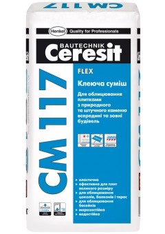 Клеюча суміш Ceresit™ СМ-117 призначена для кріплення будь-яких видів мінеральних плиток (керамічних, кам'яних, керамогранітних, клінкерних, скляних та інших) на мінеральні основи, які не деформуються, на стінах і підлогах, усередині й зовні будівель, у цивільному та промисловому будівництві.