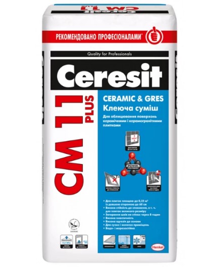 Суха суміш Ceresit СМ 11 Plus призначена для облицювання бетонних, цегляних, цементно-піщаних, цементно-вапняних, гіпсових та інших мінеральних горизонтальних та вертикальних поверхонь, які не деформуються, керамічними та керамогранітними плитками розмірами не більше ніж 60 х з водопоглинанням не менше ніж 0,5%. Суміш Ceresit СМ 11 Plus застосовується всередині та зовні будівель у житлово-цивільному та промисловому будівництві. Для облицювання поверхонь зовні будівель, а також для приклеювання плиток із водопоглинанням менше 0,5% на вертикальні поверхні необхідно застосовувати суміш Ceresit CM 11 Plus з додаванням емульсії Ceresit CC 83.